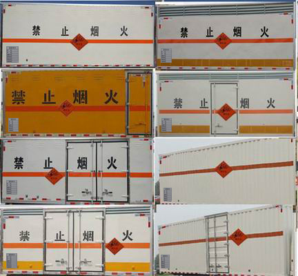 隨底盤選裝駕駛室;選裝側(cè)門型式及位置,選裝不開側(cè)門,廂體側(cè)面板選裝開百葉窗,選裝瓦楞板結(jié)構(gòu);安裝起重尾板(收起狀態(tài)水平長度為280mm),尾板質(zhì)量為350kg;該車用于運輸具有獨立容器(瓶)包裝的:黑火藥,壓縮黑火藥,電(非電)引爆雷管,爆破用,專用煙火制品,無煙火藥,糊狀火藥,爆破炸藥,導(dǎo)爆索,軟的,點燃導(dǎo)火索,射彈,帶有爆炸裝藥,聚能裝藥,不帶雷管,聚能炸藥,不帶雷管,非電引爆雷管組件,爆破用,油井用彈藥筒,固態(tài)推進(jìn)劑,動力裝置用彈藥筒,商品爆炸裝藥,不帶雷管,運送爆炸品的項號:1.1 D,1.1 D,1.1B,1.1B,1.1G ,1.1C,1.3C,1.1 D,1.1 D,1.4G,1.1D,1.1 D,1.1B,1.1B,1.3C,1.1C,1.3C,1.1D;運送危險貨物車輛的類型:EX/Ⅲ型車輛;該車為危險品貨物運輸車;僅采用前輪盤式制動器,前置排氣管,子午線輪胎,限速裝置的底盤,限速80km/h;轉(zhuǎn)向輪安裝爆胎應(yīng)急防護(hù)裝置;發(fā)動機(jī)/油耗申報值(L/100km)對應(yīng)關(guān)系為:F2.8NS6B131/11.1,Q28-130E60/11.1;該車安裝具有衛(wèi)星定位功能的行駛記錄儀;ABS系統(tǒng)型號:ABS-VI.E;生產(chǎn)企業(yè):廣州瑞立科密汽車電子股份有限公司.ABS系統(tǒng)型號:ABS-E;生產(chǎn)企業(yè):威伯科汽車控制系統(tǒng)(中國)有限公司;側(cè)面防護(hù)及后下部防護(hù)裝置材料材質(zhì):Q235,連接方式:焊接連接;后下部防護(hù)圓形后防護(hù);后下部防護(hù)裝置斷面尺寸為:Φ120mm,離地高度:310mm;該車型可選裝直接供電ETC車載裝置.選裝不帶尾板時,后防護(hù)材料:Q235,連接方式焊接,后防護(hù)截面高120mm,截面寬60mm,下邊緣離地高310mm. |