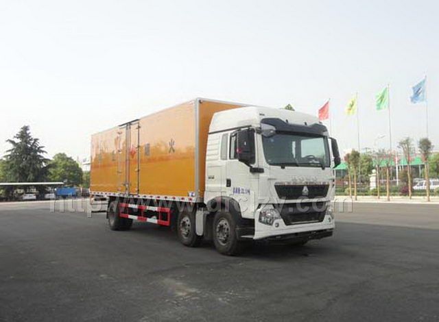 重汽豪沃前四后四國五防爆車\民爆車\炸藥運(yùn)輸車廂體外飾冷軋鋼板,內(nèi)飾防靜電鋁板,底板鋪防靜電膠板,側(cè)壁設(shè)防雨通風(fēng)窗口,帶捆綁固定拉環(huán),煙霧感應(yīng)器,防盜報警開關(guān),靜電帶,滅火器2只,車廂黃色,有危險標(biāo)志,貼有反光標(biāo)識。