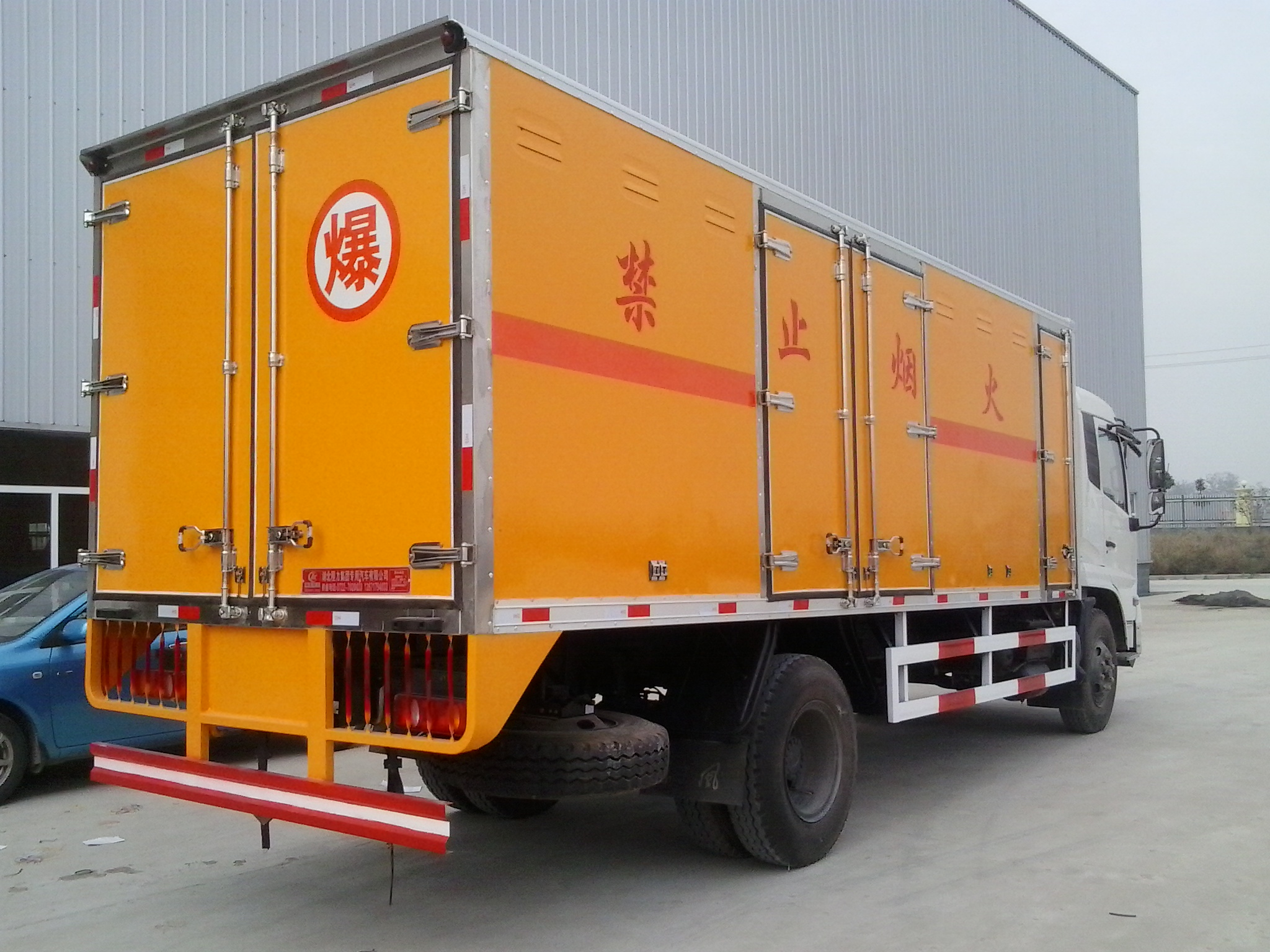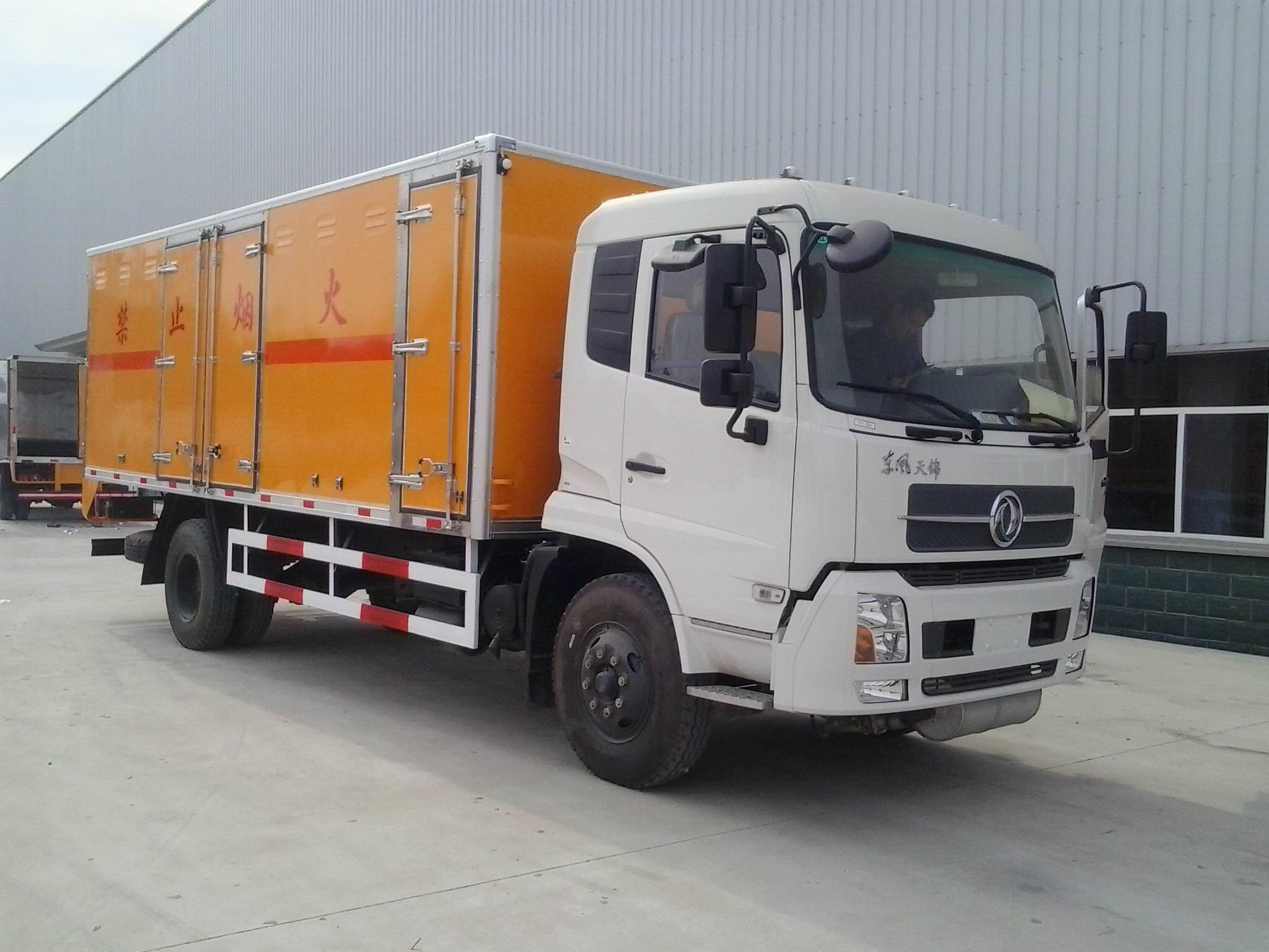 東風(fēng)天錦9.98噸防爆車|民爆車.廂體頂部密封,不可開啟。有燃油公告,環(huán)保公告, 廂體外飾冷軋鋼板,內(nèi)飾防靜電鋁板,底板鋪防靜電膠板,側(cè)壁設(shè)防雨通風(fēng)窗口,帶捆綁固定拉環(huán),煙霧感應(yīng)器,防盜報(bào)警開關(guān),靜電帶,滅火器2只,車廂黃色或白灰,有危險(xiǎn)標(biāo)志,貼有反光標(biāo)識(shí),廂體右側(cè)開側(cè)門,可選裝無側(cè)門廂體、帶隔倉(cāng)箱體。駕駛室選裝白色,箱長(zhǎng)6.1米。其他按國(guó)家爆破器材運(yùn)輸車標(biāo)準(zhǔn)執(zhí)行(底盤前盤(碟)后轂、電子限速器、行駛記錄儀、ABS)。