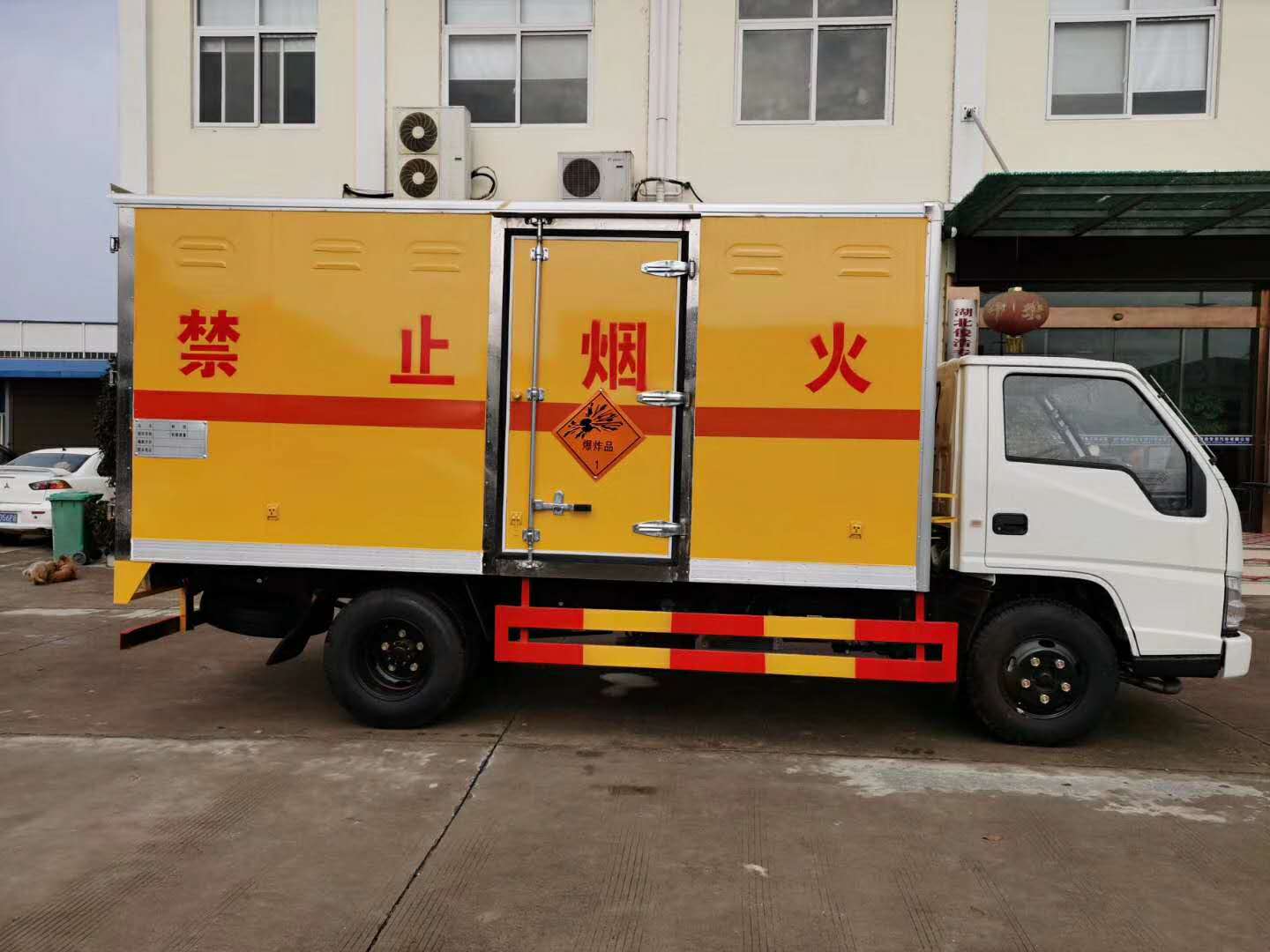 江鈴順達(dá)藍(lán)牌爆破器材運(yùn)輸車/防爆車/民爆車是危險(xiǎn)品運(yùn)輸車的一種,江鈴115馬力發(fā)動(dòng)機(jī),五檔變速箱,3360軸距,7.00鋼絲胎,帶方向助力,N600單排駕駛室,ABS,限速80,前盤制動(dòng),排氣管前置等。有燃油和環(huán)保公告,上戶無憂。江鈴順達(dá)此款底盤還能裝易燃?xì)怏w廂式運(yùn)輸車,煙花爆竹專用運(yùn)輸車,雜項(xiàng)危險(xiǎn)物品廂式運(yùn)輸車和易燃液體廂式運(yùn)輸車,整車不超重。 江鈴順達(dá)藍(lán)牌爆破器材運(yùn)輸車/防爆車/民爆車廂體外飾外板采用1mm厚冷軋板有一次成型的百葉窗,內(nèi)飾為導(dǎo)電性能良好的鋁板含透氣孔,內(nèi)襯為矩形管骨架牢靠穩(wěn)定,內(nèi)部填充為透氣防潮阻燃的擠塑板,底板和車廂前下部鋪橡膠皮,廂體外部上下鋁合金型材包邊,后門雙開,右側(cè)選裝側(cè)開門,內(nèi)部有固定貨物的臥環(huán),外部有靜電帶,滅火器,防火罩,廂內(nèi)安裝煙霧警報(bào)器和門防盜報(bào)警器.
