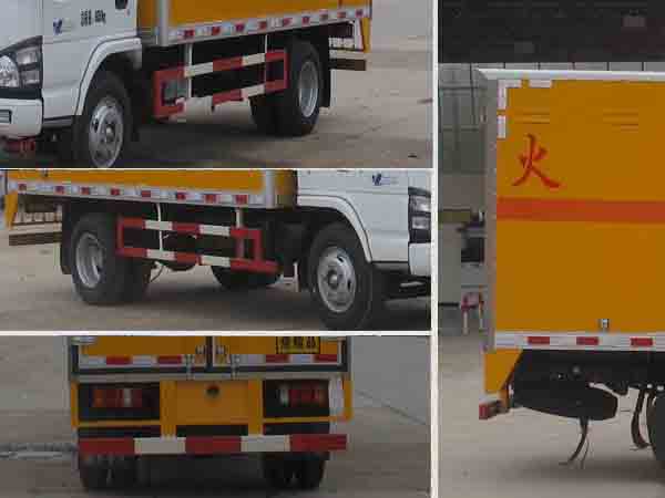 運(yùn)輸品名:炸藥,雷管,類項(xiàng)號(hào): 1.1D,1.1B。廂體頂部封閉不可開啟,側(cè),后防護(hù)裝置材料材質(zhì)為Q235A碳鋼,側(cè)防護(hù)與箱體底部螺栓連接,后防護(hù)裝置與車架采用焊接連接,后防護(hù)截面尺寸(mm):100×50,離地高度為430mm。安裝底盤的前置排氣管結(jié)構(gòu),安裝前輪盤式制動(dòng)器,安裝子午線輪胎和帶ABS的底盤。安裝帶有衛(wèi)星定位功能的行駛記錄儀。ABS系統(tǒng)生產(chǎn)廠家/型號(hào): 浙江亞太機(jī)電股份有限公司/APG3550500A4。 |