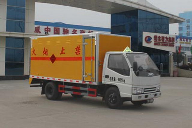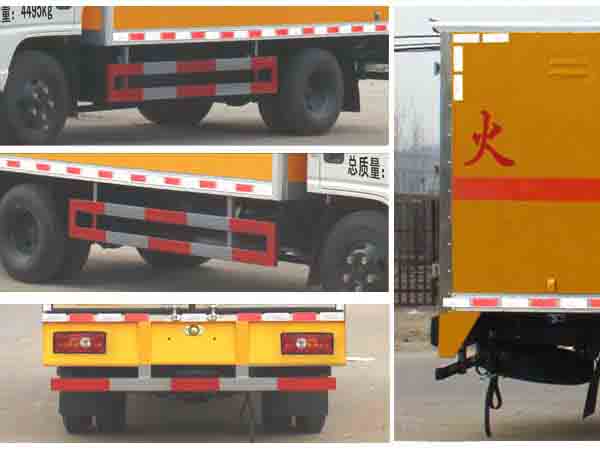 廂體頂部封閉,不可開(kāi)啟。隨底盤(pán)選裝駕駛室。 并選裝側(cè)開(kāi)門(mén)。側(cè)/后防護(hù)裝置材料材質(zhì)為Q235A碳鋼,側(cè)防護(hù)與副梁,后防護(hù)裝置與車(chē)架均采用焊接連接,后防護(hù)斷面尺寸(寬×高)50×100(mm),離地高度為440mm.運(yùn)輸品名:炸藥,雷管,煙花爆竹等,類(lèi)項(xiàng)號(hào):1.1B,1.1D,1.1G,1.2G,1.3G,1.4G等;安裝帶衛(wèi)星定位功能的行駛記錄儀;配裝限速裝置,最高時(shí)速80km/h。僅采用有前盤(pán)制動(dòng)器和安裝ABS的底盤(pán)。僅采用子午線輪胎。僅采用排氣管前置的底盤(pán)。該車(chē)裝有ABS;ABS型號(hào):355080020,生產(chǎn)廠家:浙江亞太機(jī)電股份有限公司。僅采用JX493ZLQ4發(fā)動(dòng)機(jī),油耗值為12.6。 |