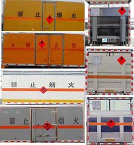 廂體頂部封閉,不可開(kāi)啟.運(yùn)輸介質(zhì):黑火藥,壓縮黑火藥,電引爆雷管,爆破炸藥,點(diǎn)燃導(dǎo)火索等.運(yùn)輸介質(zhì)類別和項(xiàng)別號(hào):1.1D,1.1D,1.1B,1.1D,1.4G,1.1G等.選裝不帶側(cè)門,側(cè)門型式及位置;選裝液壓升降尾板,廂體顏色可變化,文字噴涂位置可變化。隨底盤選裝駕駛室;僅選用前盤式制動(dòng)器,前置排氣管,子午線輪胎,限速裝置的底盤,限速80km/h,該車安裝具有衛(wèi)星定位功能的行駛記錄儀。側(cè),后防護(hù)裝置材料材質(zhì)為碳鋼/Q235B;與副梁采用螺栓加焊接連接;后部防護(hù)斷面尺寸(mm):100×50,后部防護(hù)離地高度(mm):390. ABS型號(hào)為3631010-C2000,生產(chǎn)廠家為東科克諾爾商用車制動(dòng)系統(tǒng)(十堰)有限公司。 |
