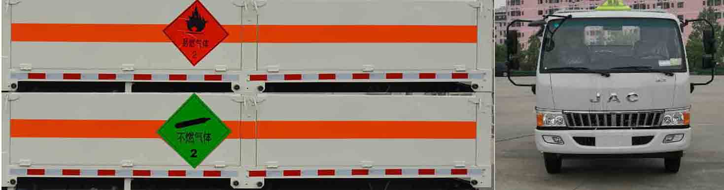 江淮駿鈴E6欄板式氣瓶運輸車為廂體選裝無柵欄.運輸具有獨立罐(瓶)容器包裝的易燃氣體:液化石油氣,壓縮天然氣,乙炔,乙烷,丁烷,丁烯,丙烯.甲烷.二甲醚,壓縮氫.類項號2.1,運輸具有獨立容器包裝的非易燃無毒氣體:二氧化碳,壓縮氧. 壓縮空氣(氮,氦,氬,氖),類項號2.2,該車運輸?shù)臍馄渴⒀b介質(zhì)2.1項易燃氣體時,車輛左、右側(cè)及后部粘貼“易燃氣體”標示牌,該車運輸?shù)臍馄恐惺⒀b介質(zhì)2.2項非易燃無毒氣體時,車輛左、右側(cè)及后部粘貼“不燃氣體”標示牌.廂體顏色可變化.側(cè)面及后下部防護裝置材料為Q235,與車架采用焊接連接.后下部防護裝置斷面尺寸(mm):120×50,離地高度:490mm。選裝液壓升降尾板,選裝液壓尾板時收起狀態(tài)的水平長度為300mm,僅采用排氣管前置、子午胎,限速裝置,輔助制動裝置和前盤制動器的底盤;限速80km/h.。