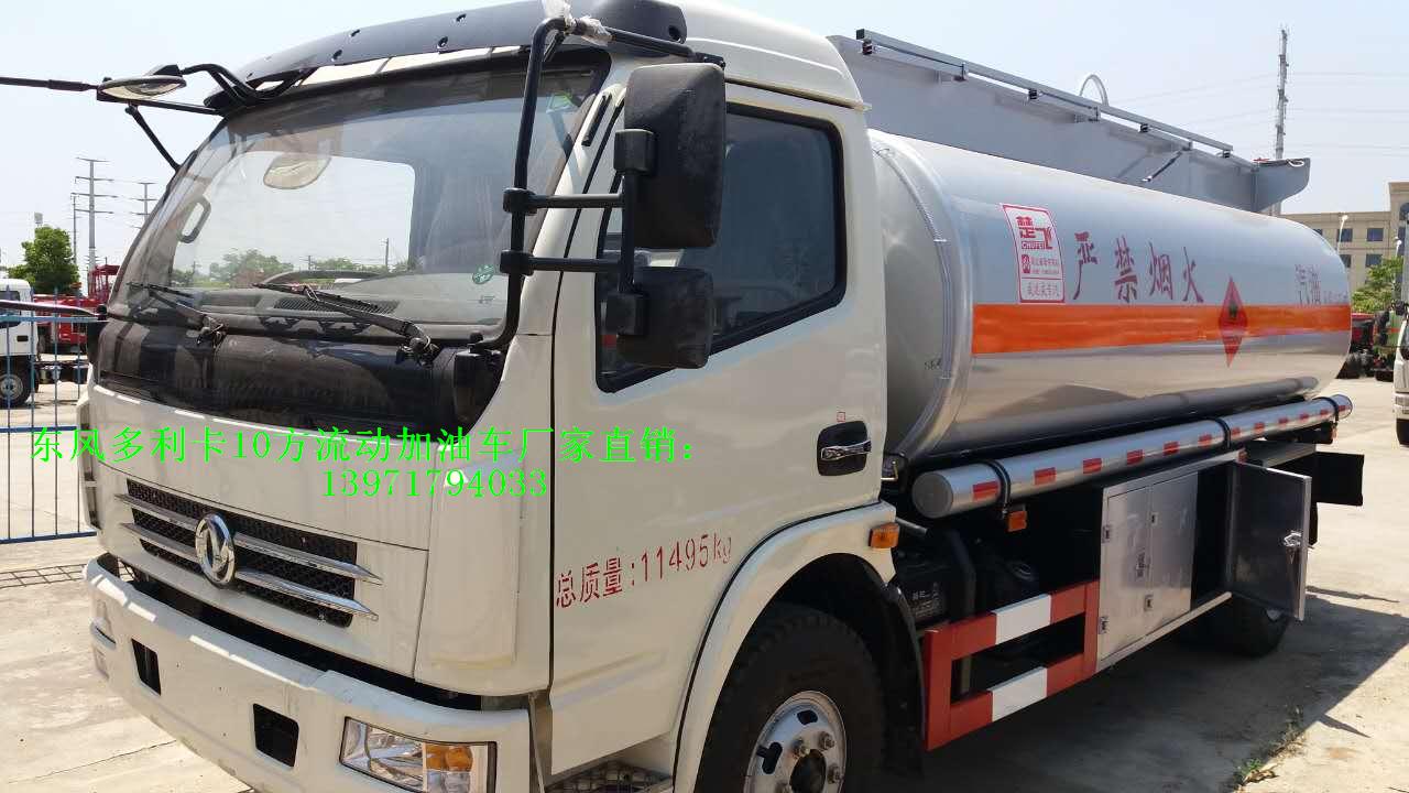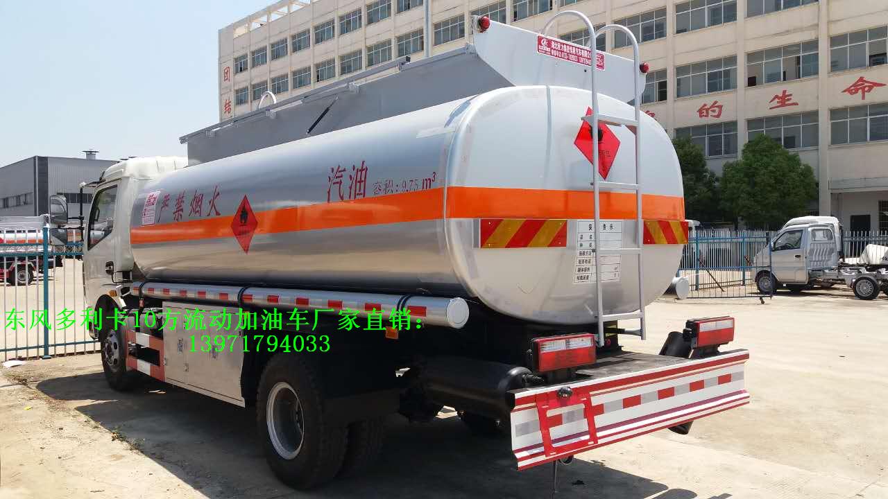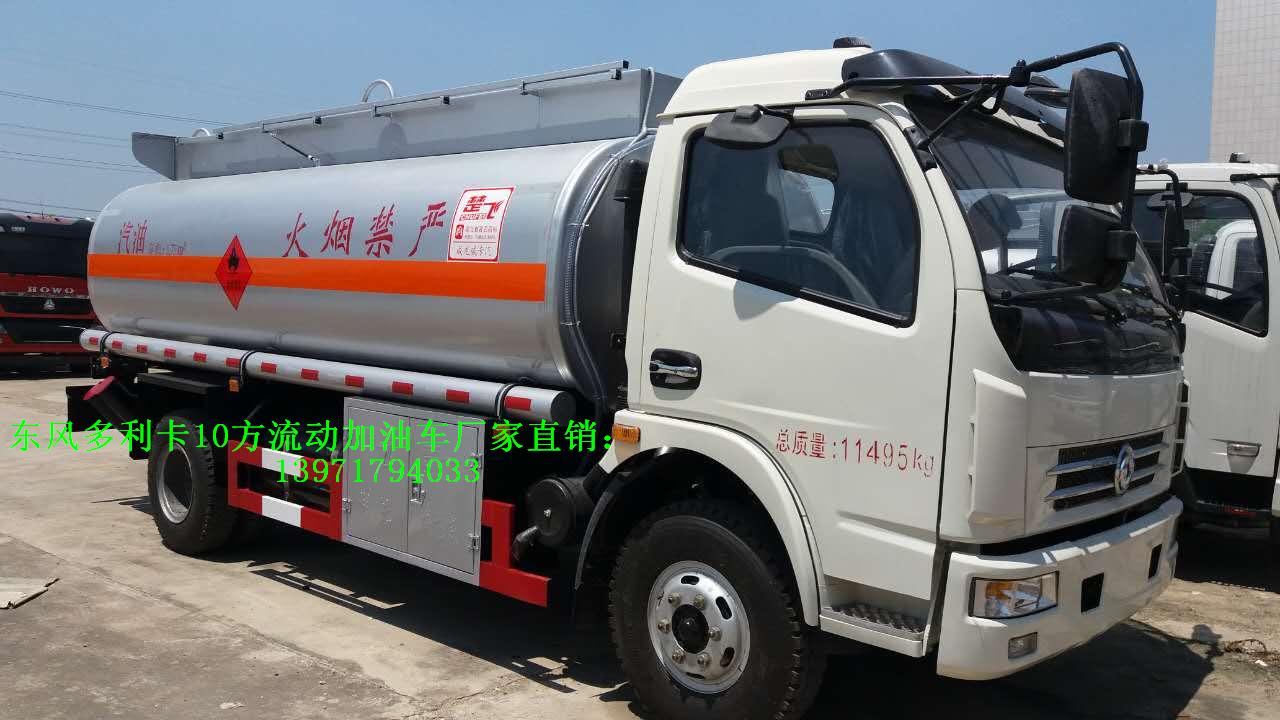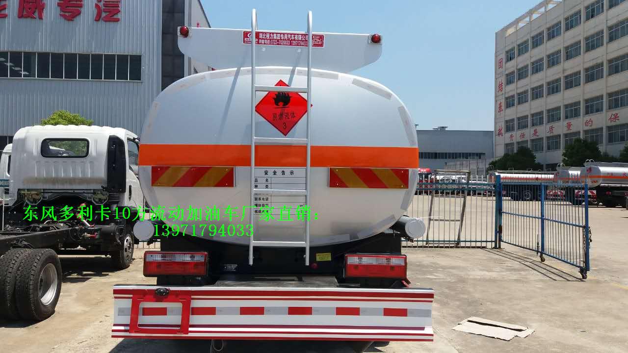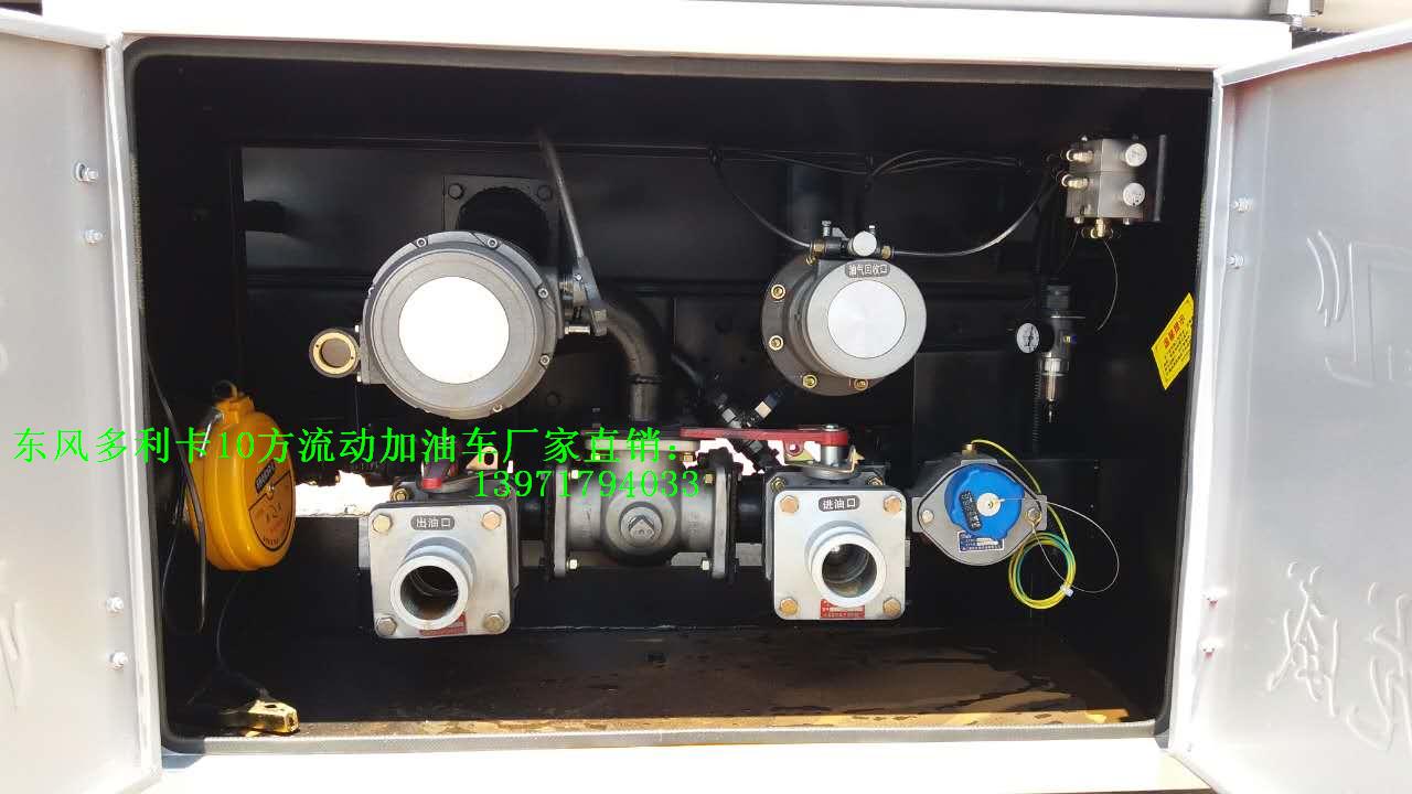 東風多利卡10方國五流動加油車客戶選裝配置:優(yōu)質鋁合金球閥(閥門) ;可分倉(附加一套歐標罐口及海底閥) ;泵進/泵出流量表(合肥流量表/重慶流量表),罐體內部襯塑或罐體內部防腐油漆,升降走道板(保護罐口).選裝加油機倉內或外裝大梁。