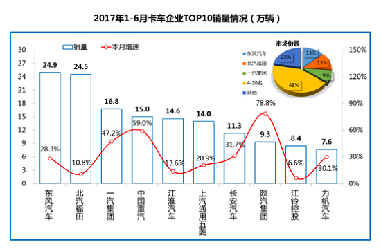 2017年1-6月,我國貨車產(chǎn)銷182.43萬輛和188.06萬輛,同比增長18.70%和22.63%,增速比上年同期提升15.12個(gè)百分點(diǎn)和18.60個(gè)百分點(diǎn)。其中,東風(fēng)汽車銷售貨車24.9萬輛,排名第一,增幅為28.3%;銷量前十名中,陜汽集團(tuán)企業(yè)銷量增幅最大為78.8%,銷售貨車9.3萬輛?ㄜ嚻髽I(yè)銷量如下圖: