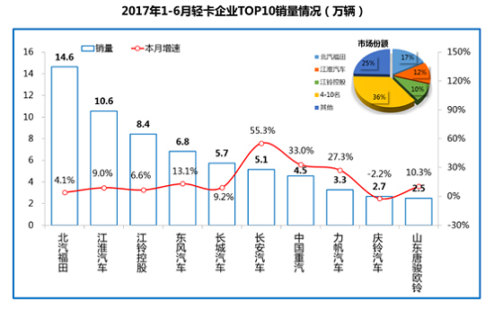 2017年1-6月,我國輕型貨車產(chǎn)銷84.50萬輛和85.26萬輛,同比增長9.36%和9.66%。其中,北汽福田累計(jì)銷售輕型貨車14.6萬輛,排名第一,同比增長4.1%;銷量前十名中,長安汽車銷量增幅最大,增幅達(dá)到了55.3%。輕卡企業(yè)銷量見下圖: