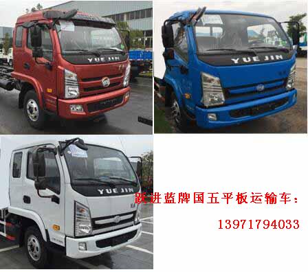 南京躍進(jìn)藍(lán)牌國(guó)五平板運(yùn)輸車采用南京躍進(jìn)平板運(yùn)輸車專用二類工程車底盤(pán),選裝云內(nèi)102馬力國(guó)五發(fā)動(dòng)機(jī),五擋帶副變速箱,輪胎為鋼絲胎7.50R16 6PR,安裝帶有衛(wèi)星定位功能的行駛記錄儀. ABS,選裝駕駛室.