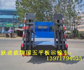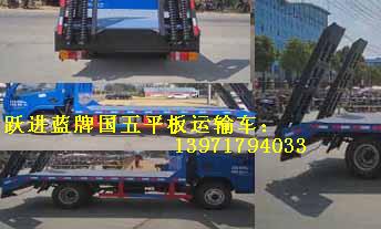 南京躍進(jìn)藍(lán)牌國(guó)五平板運(yùn)輸車用于裝載運(yùn)輸工合機(jī)械、挖機(jī)、鏟車、收割等工合機(jī)械運(yùn)輸,車后部帶后爬梯,帶支腿(液壓或手動(dòng)),底板為5mm花紋鋼板,方鋼承載筋,貨臺(tái)承載面尺寸長(zhǎng)4000mm, 寬2400mm,承載面可選裝手動(dòng)或液壓水平支出.平板離地高度:950mm。爬梯長(zhǎng)度1000-1500mm,傾角30-45度.