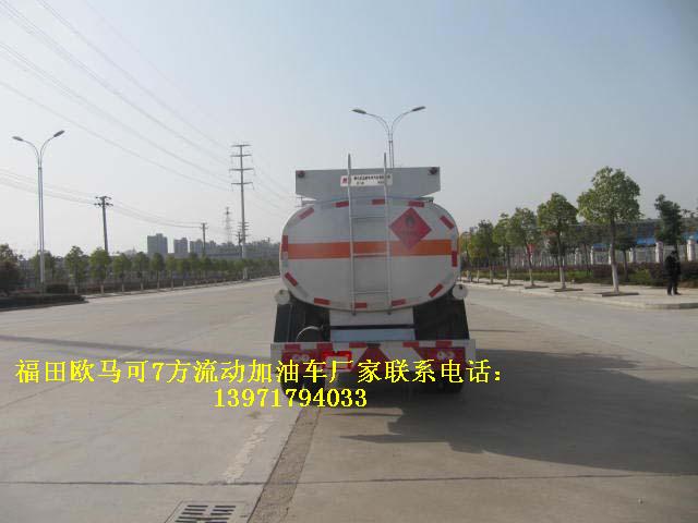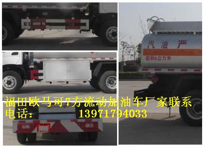 福田歐馬可7方國(guó)五流動(dòng)加油車(chē)罐體有效容積:6立方米(公告容積),實(shí)際容積7方(嚴(yán)格按尺寸制作),介質(zhì):汽油,柴油,類(lèi)項(xiàng)號(hào):3,密度:700千克/立方米,罐體外形尺寸(長(zhǎng)×寬×高)(mm):1,加油機(jī)內(nèi)裝于罐體前部時(shí):4200(含加油機(jī)倉(cāng)800)×1960×1320,2,加油機(jī)外裝在車(chē)架一側(cè)時(shí):4200x1760x1170;.隨底盤(pán)選裝駕駛室,排氣管前置,安裝具有衛(wèi)星定位功能的行駛記錄儀,安裝前輪盤(pán)式制動(dòng)器,僅采用底盤(pán)子午線(xiàn)輪胎以及限速裝置,限速80km/h。