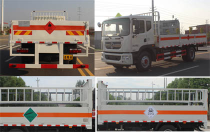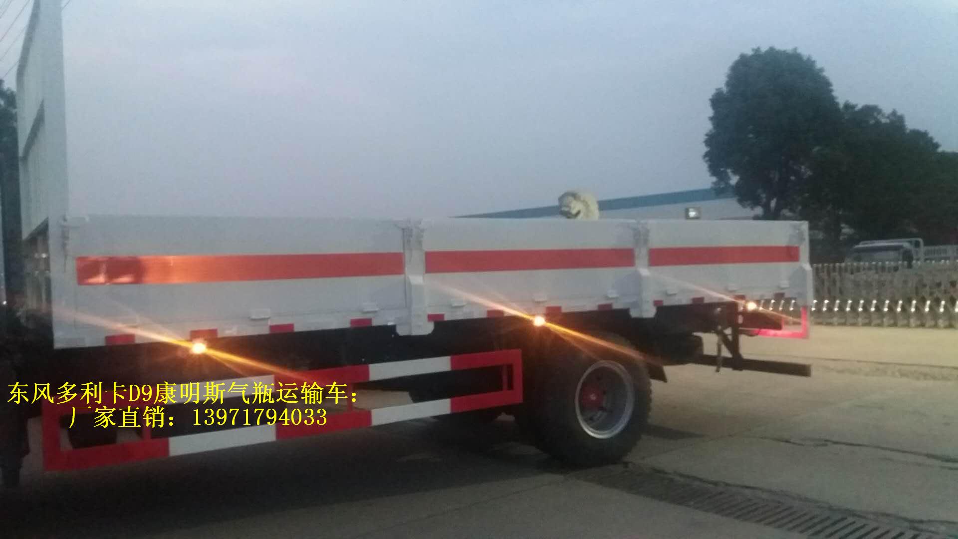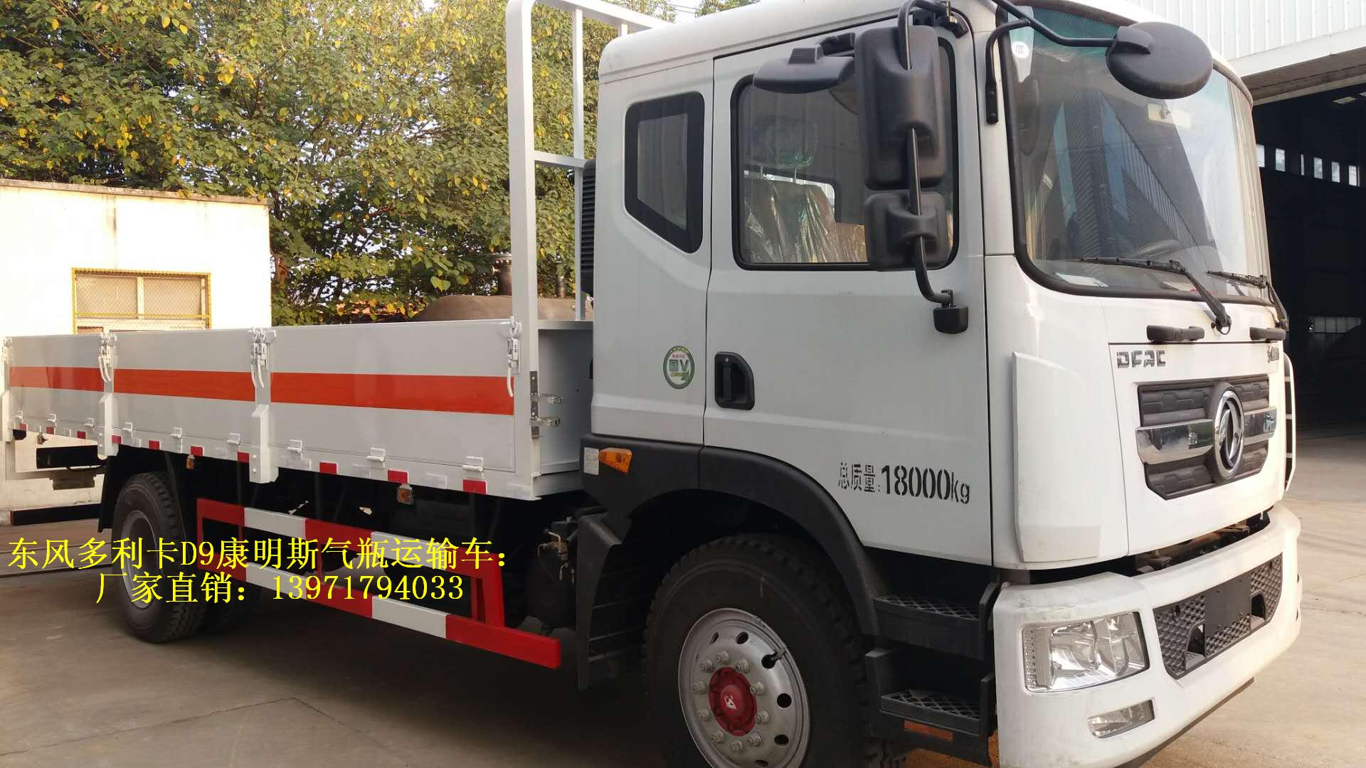 東風(fēng)多利卡D9康明斯氣瓶運(yùn)輸車為廂體選裝無柵欄.運(yùn)輸具有獨(dú)立罐(瓶)容器包裝的易燃?xì)怏w:液化石油氣,壓縮天然氣,乙炔,乙烷,丁烷,丁烯,丙烯.甲烷.二甲醚,壓縮氫.類項(xiàng)號2.1,運(yùn)輸具有獨(dú)立容器包裝的非易燃無毒氣體:二氧化碳,壓縮氧. 壓縮空氣(氮,氦,氬,氖),類項(xiàng)號2.2,該車運(yùn)輸?shù)臍馄渴⒀b介質(zhì)2.1項(xiàng)易燃?xì)怏w時(shí),車輛左、右側(cè)及后部粘貼“易燃?xì)怏w”標(biāo)示牌,該車運(yùn)輸?shù)臍馄恐惺⒀b介質(zhì)2.2項(xiàng)非易燃無毒氣體時(shí),車輛左、右側(cè)及后部粘貼“不燃?xì)怏w”標(biāo)示牌.廂體顏色可變化.側(cè)面及后下部防護(hù)裝置材料為Q235,與車架采用焊接連接.后下部防護(hù)裝置斷面尺寸(mm):120×50,離地高度:490mm。選裝液壓升降尾板,選裝液壓尾板時(shí)收起狀態(tài)的水平長度為300mm,僅采用排氣管前置、子午胎,限速裝置,輔助制動(dòng)裝置和前盤制動(dòng)器的底盤;限速80km/h.。