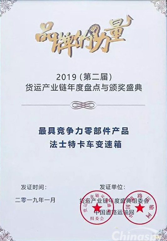 昨日,“品牌的力量”2019貨運產業(yè)鏈年度盤點與頒獎盛典在京順利召開。法士特變速器榮獲“最具競爭力零部件產品”獎。