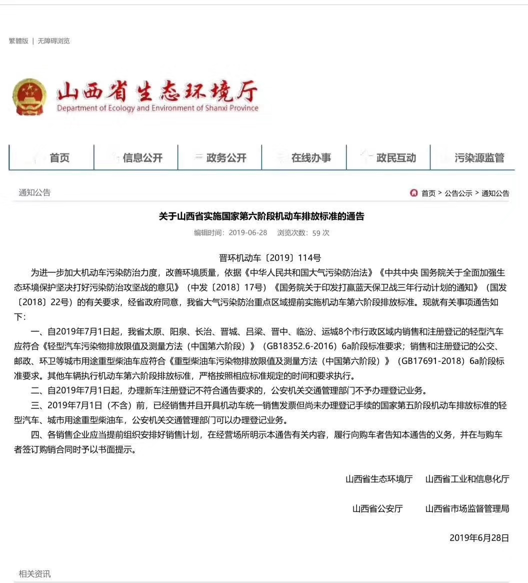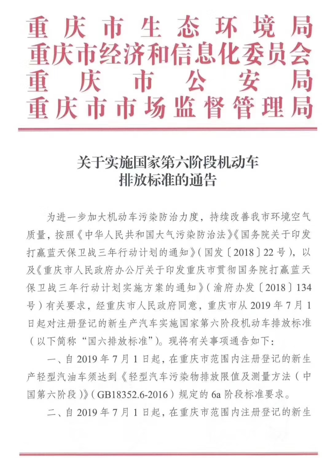 緊急通知!昨日,山西省,重慶市也下達(dá)正式文件,2019年7月1日起輕型車(chē)輛將開(kāi)始執(zhí)行國(guó)六排放標(biāo)準(zhǔn)!